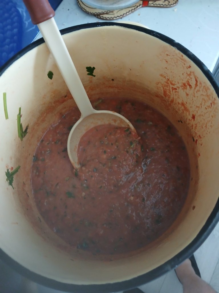 - Смесвате всички зеленчуци с пюрираните домати. Подправяте със солта и черния пипер, добавяте и 2-3 супени лъжици зехтин.