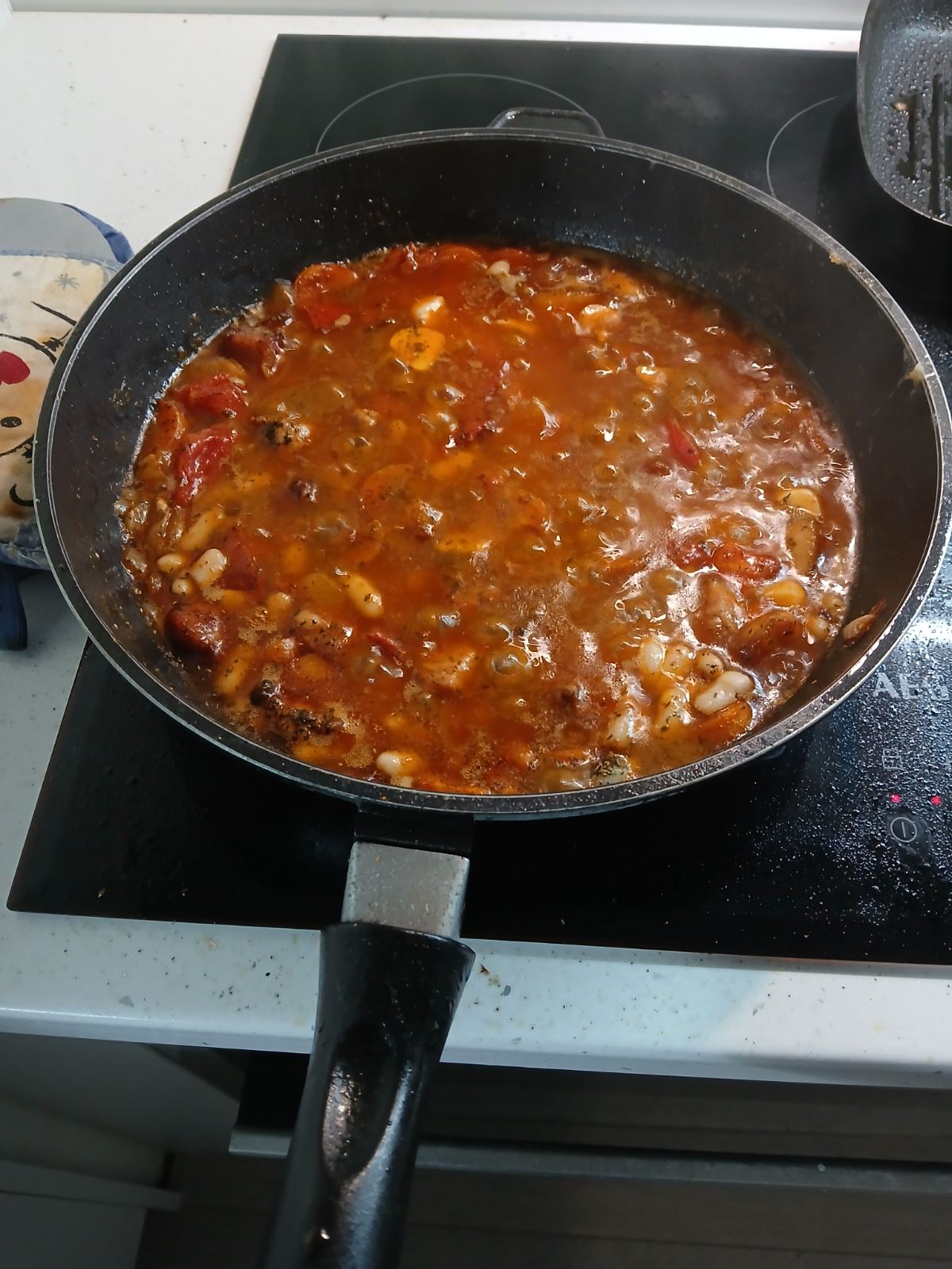 - сложете в тигана боба и бекона и добавете и скилидките чесън, джоджена, както и останалото олио оставете да заври