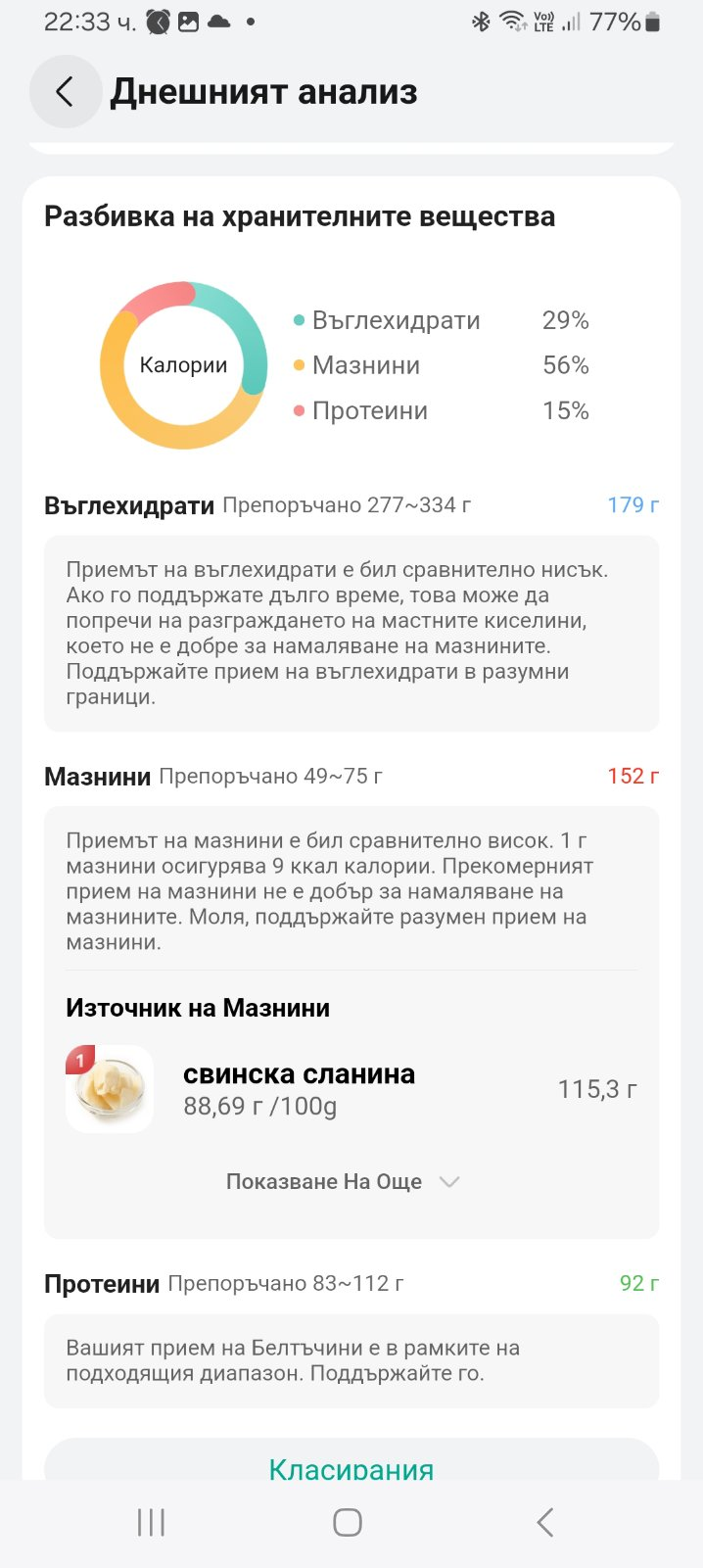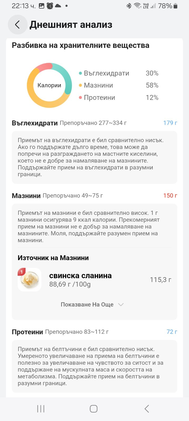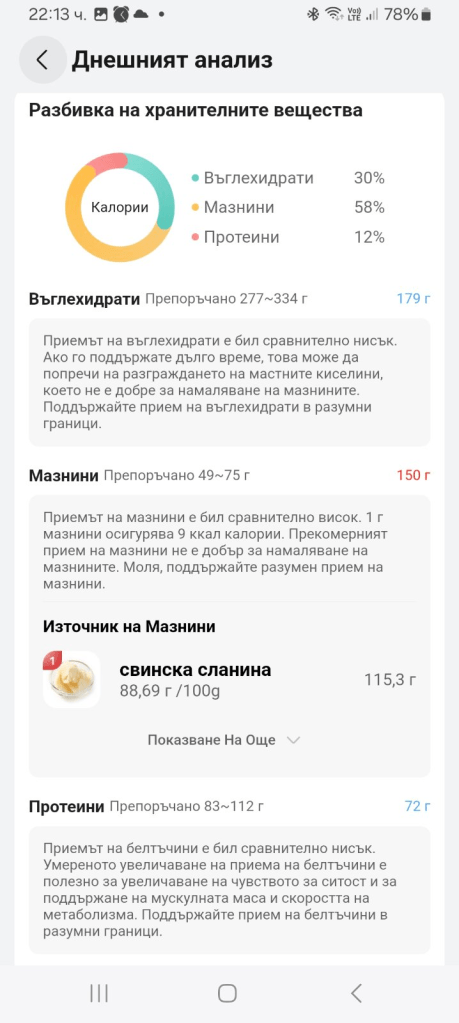 Също така показва след въвеждането на храненията за деня и разбивката на проценти въглехидрати, протеини и мазнини. Златната мярка е 40 % въглехидрати, 30 % протеини и 30 % мазнини
