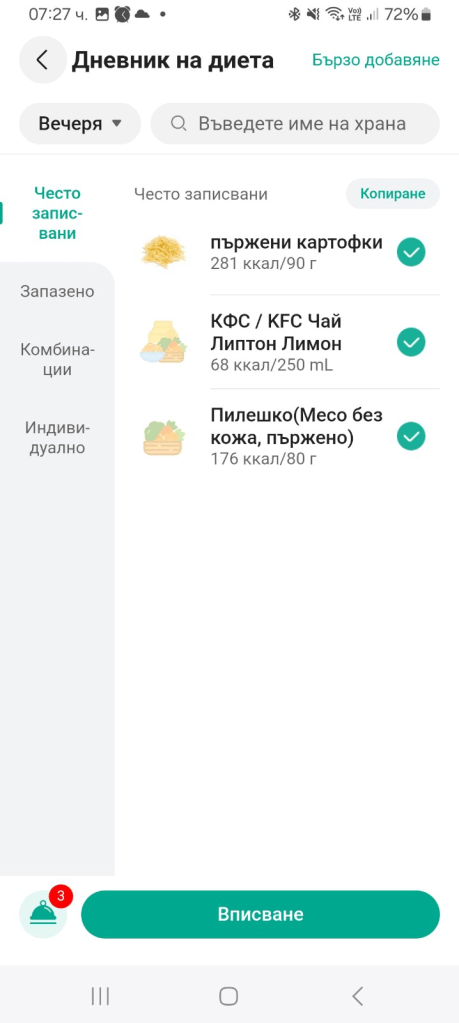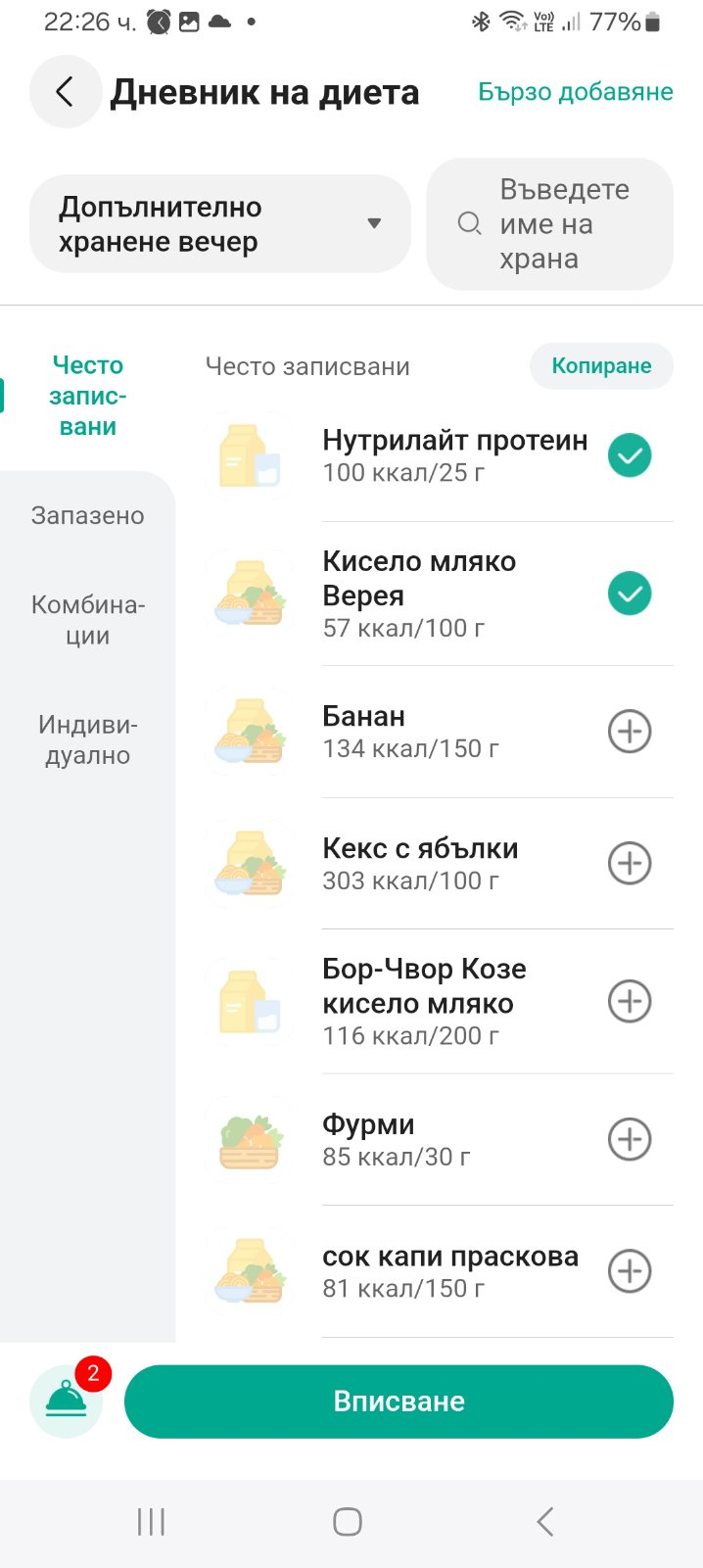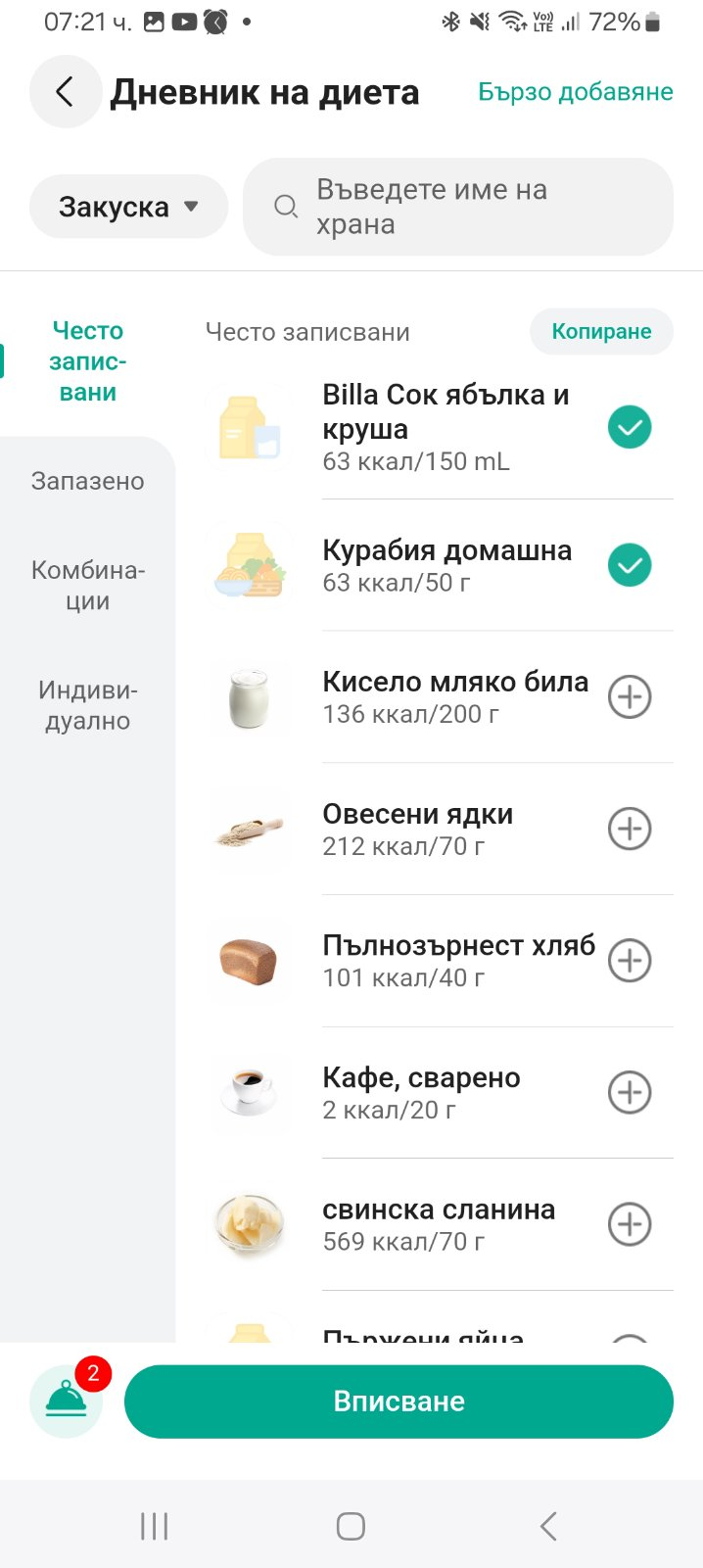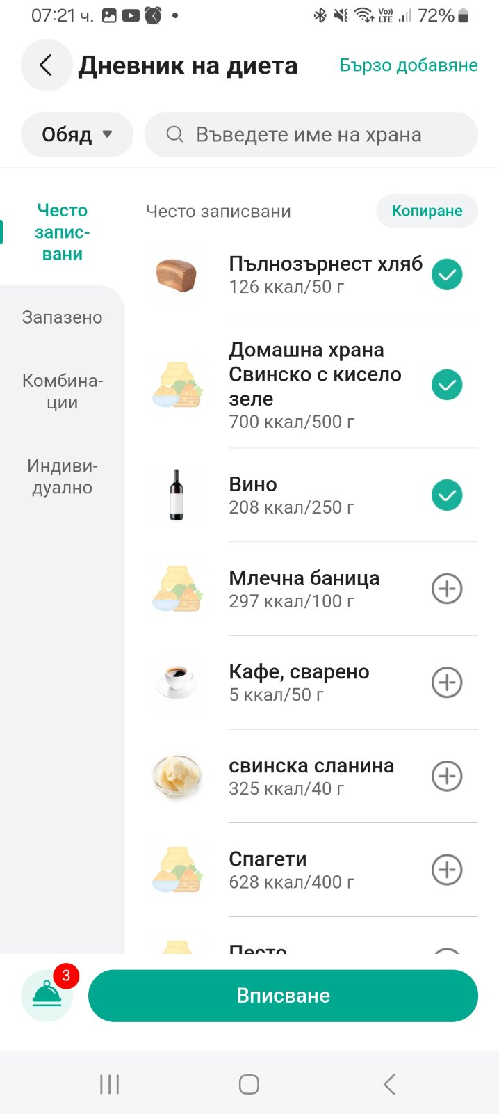 Въвеждате закуската като където пише горе вдясно ” Въведете име на храната” е търсачка за различните храни и ястия. Ако не откриете това което ядете потърсете подобно ястие или храна от списъка които ви се показва в повечето случаи килокалориите са сходни на 100 грама. След като изберете храната от търсачката тя се появява в списъка. После кликвате върху името и в списъка и въвеждате грамажа и след като натиснете ок натискате бутона най-долу вписване. Готово въвели сте храната която сте консумирали тя се вижда най-горе в списъка и вдясно е отбелязана с зелен чек символ. Можете да отмените избора си като кликнете на зеления чек символ. От екрана се излиза с клик горе вляво на стрелката вляво от надписа “Дневник на диета”